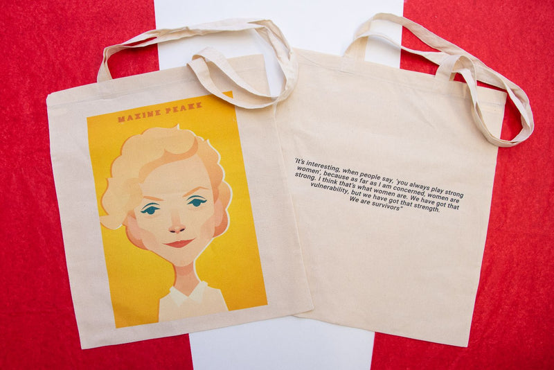 Maxine Peake tote bag with design by Stanley Chow as part of a 'Great Northerners' series created by Stan for Great Northern Warehouse.