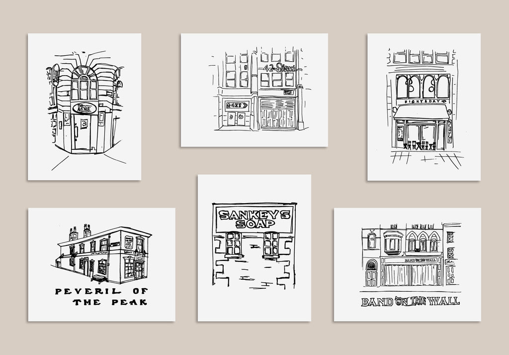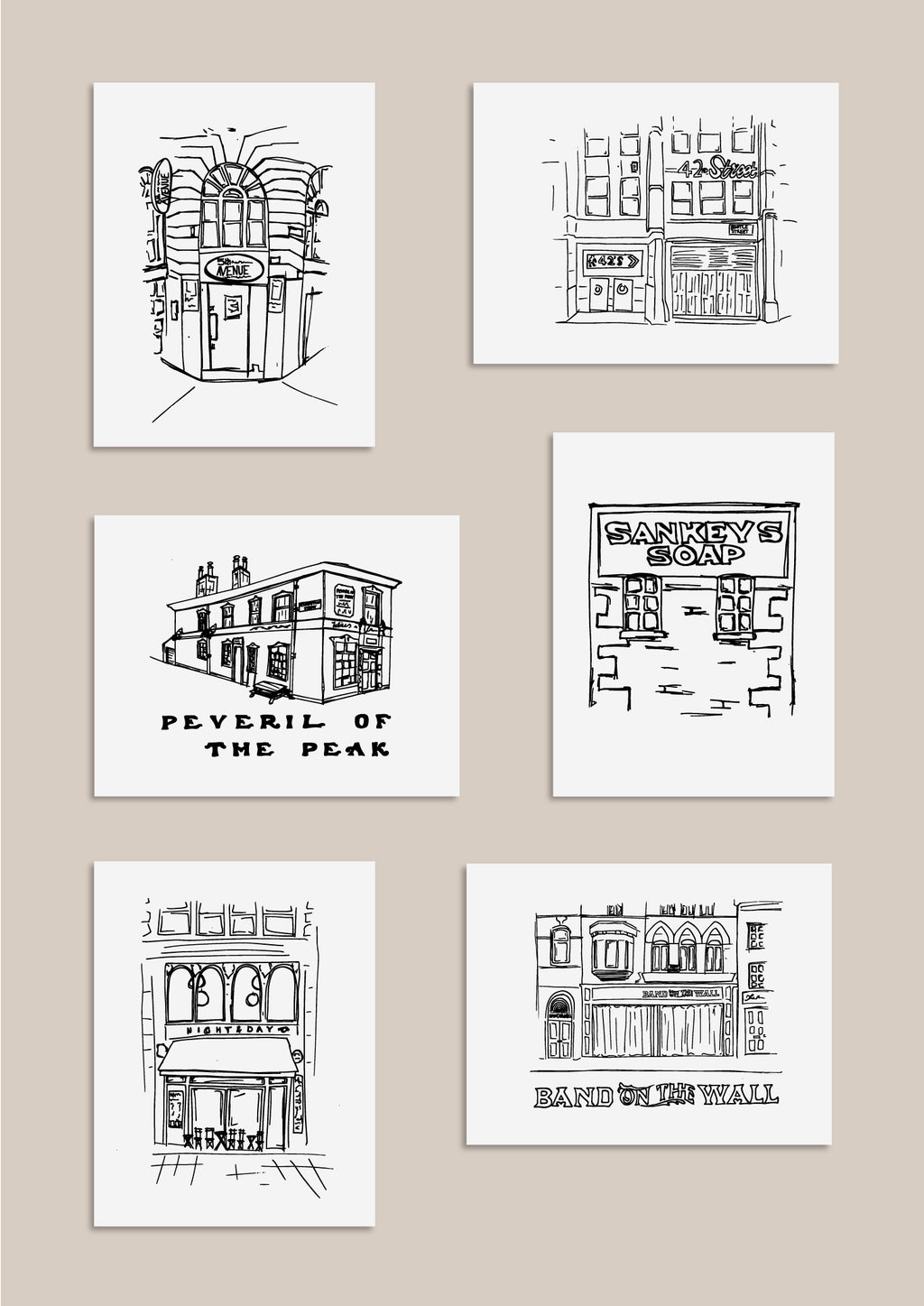 Created especially for Forever Manchester, each postcard is hand sketched by local artist Olivia Woodward, capturing the character of some of the city’s most legendary pubs and clubs.