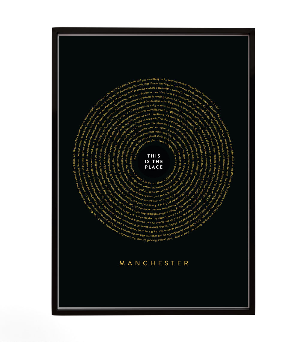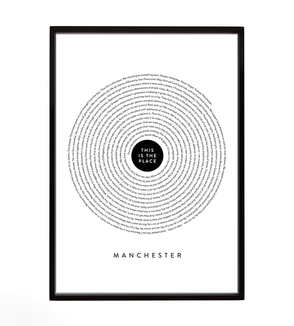 Brand new Custom Vinyl Print of our iconic poem 'This Is The Place' by Tony Walsh. Featuring the full poem in abstract record design.