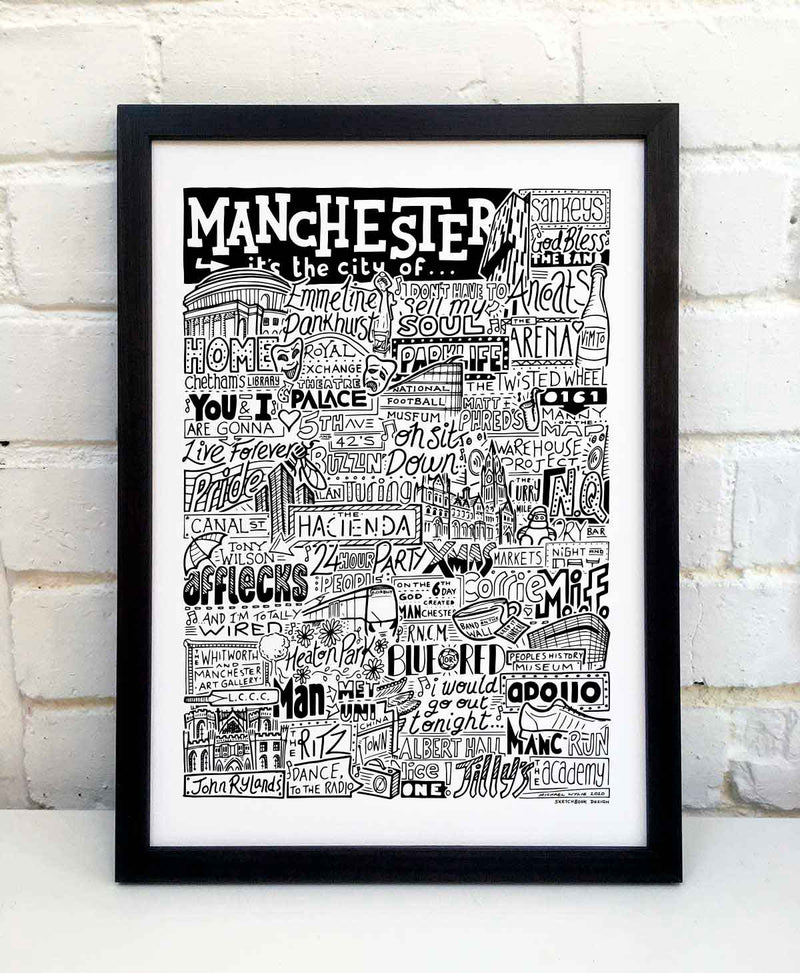 This hand-drawn print is inspired by the wonderful city of Manchester. The design features iconic landmarks, people, places and music from the city. The illustration tells the story of Manchester’s past and present.